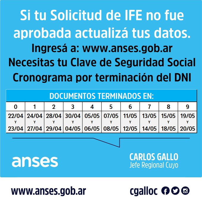 Hoy en Radio Comunitaria Cuyum, hablamos con el titular de ANSES en Mendoza lic. Carlos Gallo, que nos da precisiones sobre reclamos del IFE (ingreso familiar de emergencia) y sobre los mecanismos para cobrar o inscribirse en el ingreso familiar de emergencia; además información referida a la fe de vida solicitada a pensionados y jubilados y novedades para beneficiarios que accedieron a prestamos de ANSES.